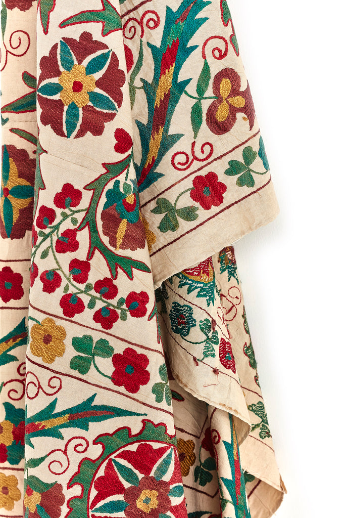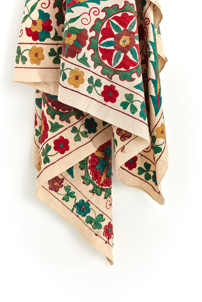 Today, old Suzanis are highly prized as collectable items; they look wonderful loosely framed as a wall-hanging, but can equally be used as a table-cloth or bed-spread, or simply as a beautiful piece of embroidery to be admired & treasured.