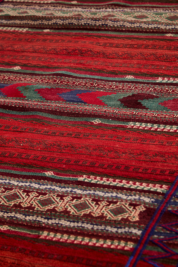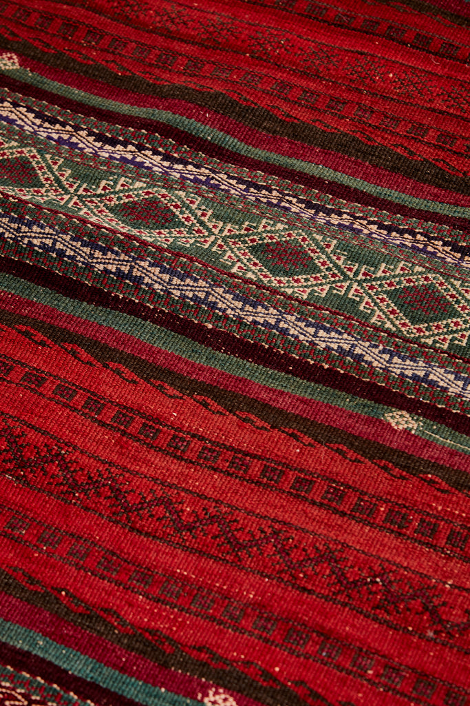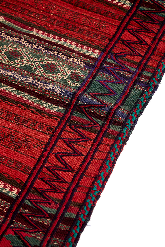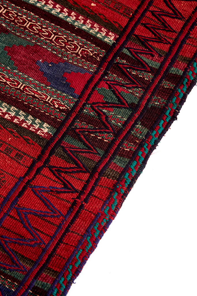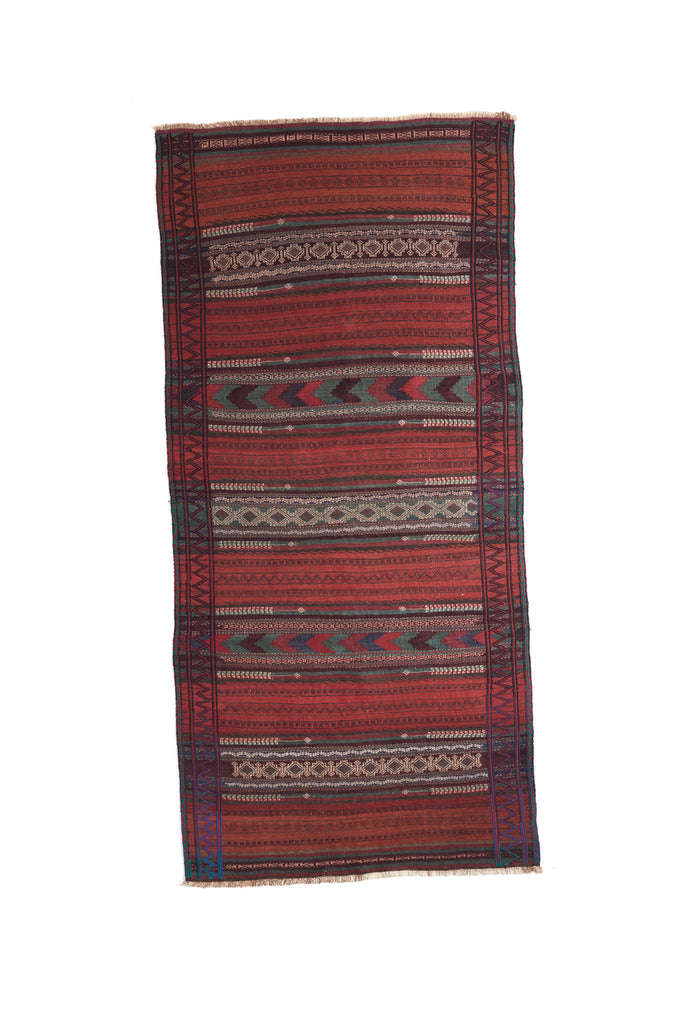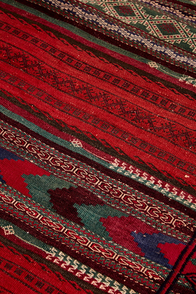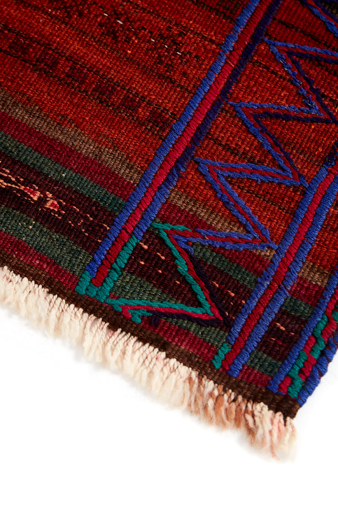 Baser is a Balouch kilim from Western Afghanistan by the Iranian border. Woven in 100% wool, Baser is in excellent condition despite being 80 years old. Very finely woven with restful reds, greens, browns and small pops of colour detailed throughout.