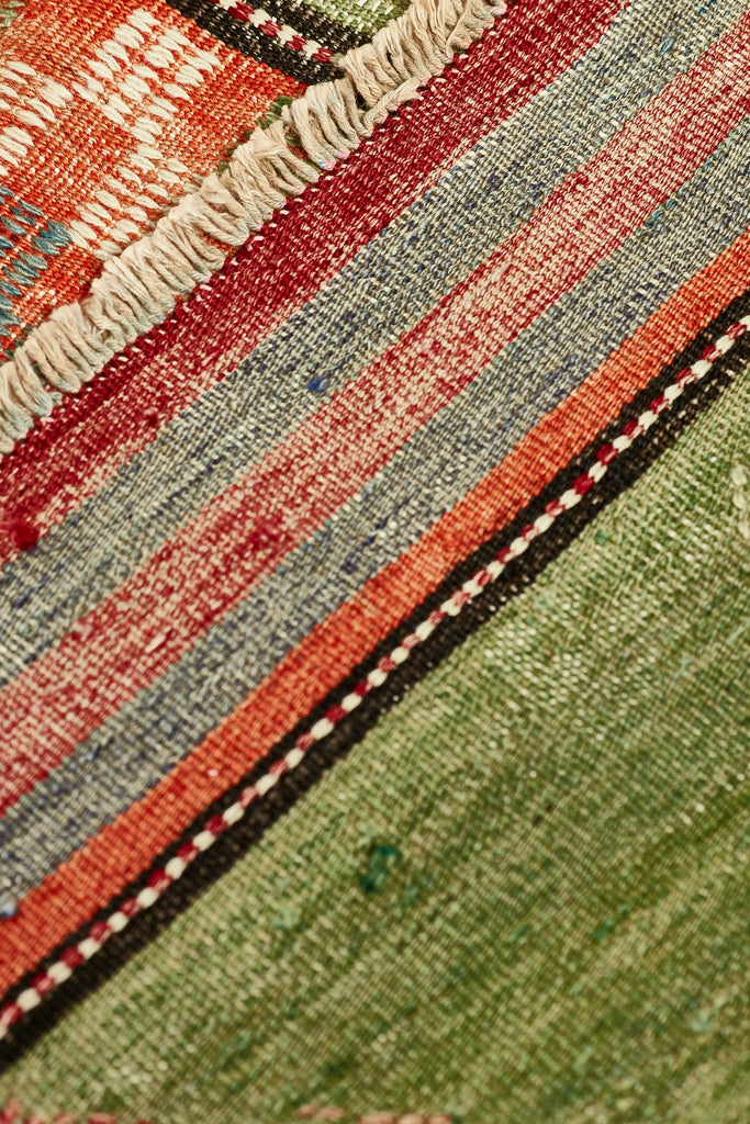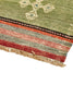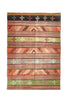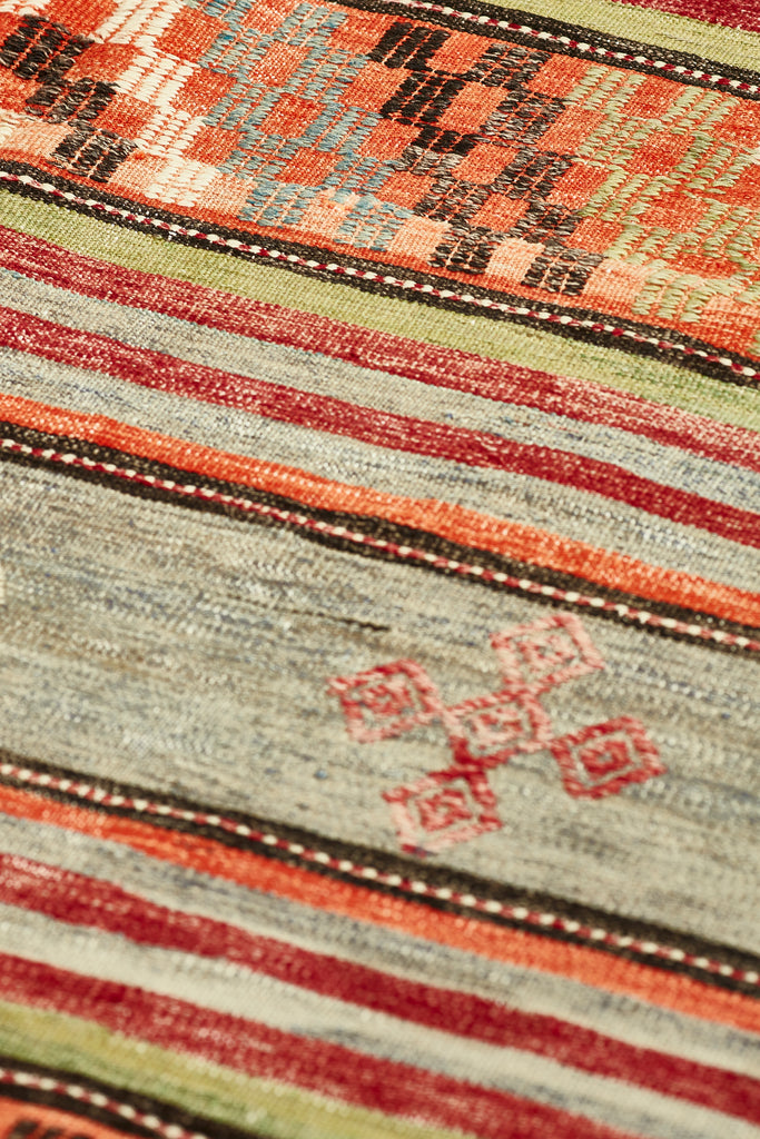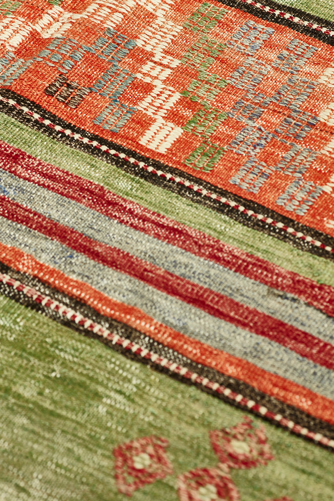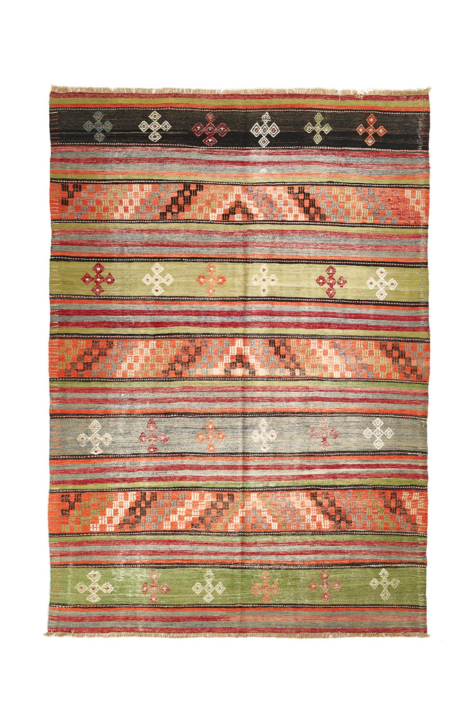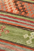 This kilim has been woven in beautifully soft natural dyes and has a dominant green base which is less common in handwoven rugs. This is because green was made by mixing blue and yellow together and required an extra step in the dying process.