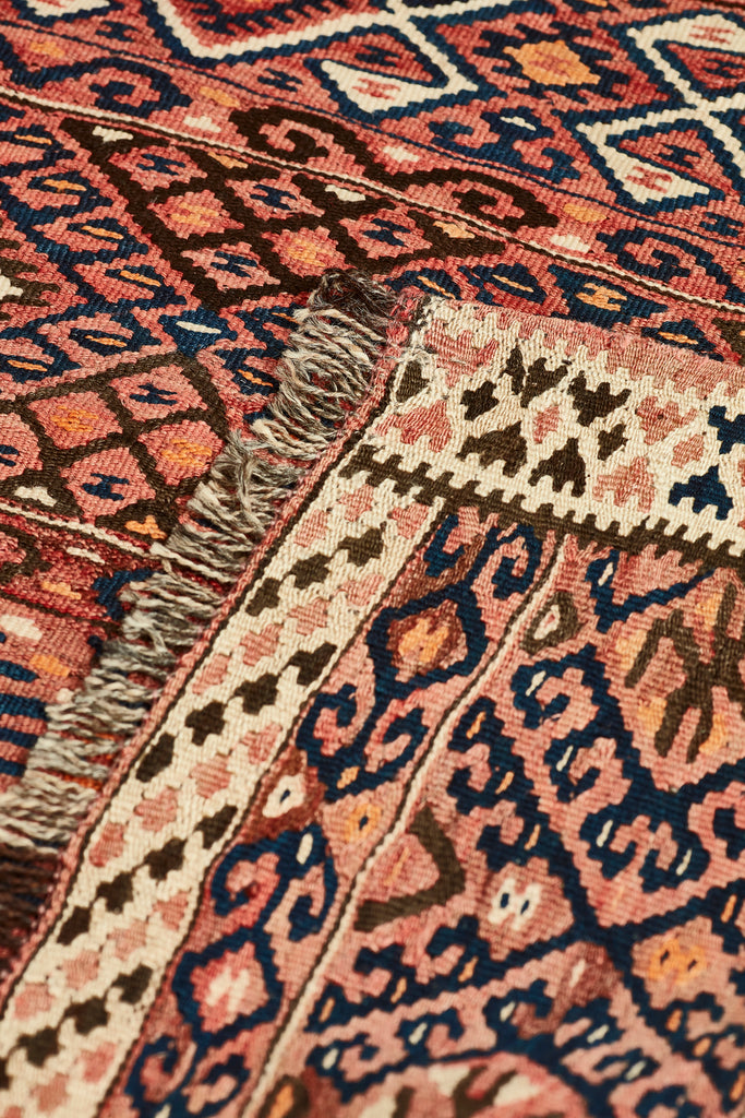 This kilim has been woven in natural dyes that are beautifully soft and natural with pinks, browns and blues, with cream border detailing. A very beautiful piece.