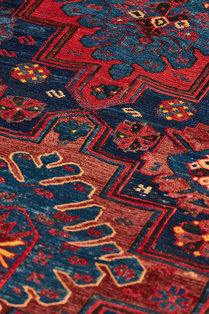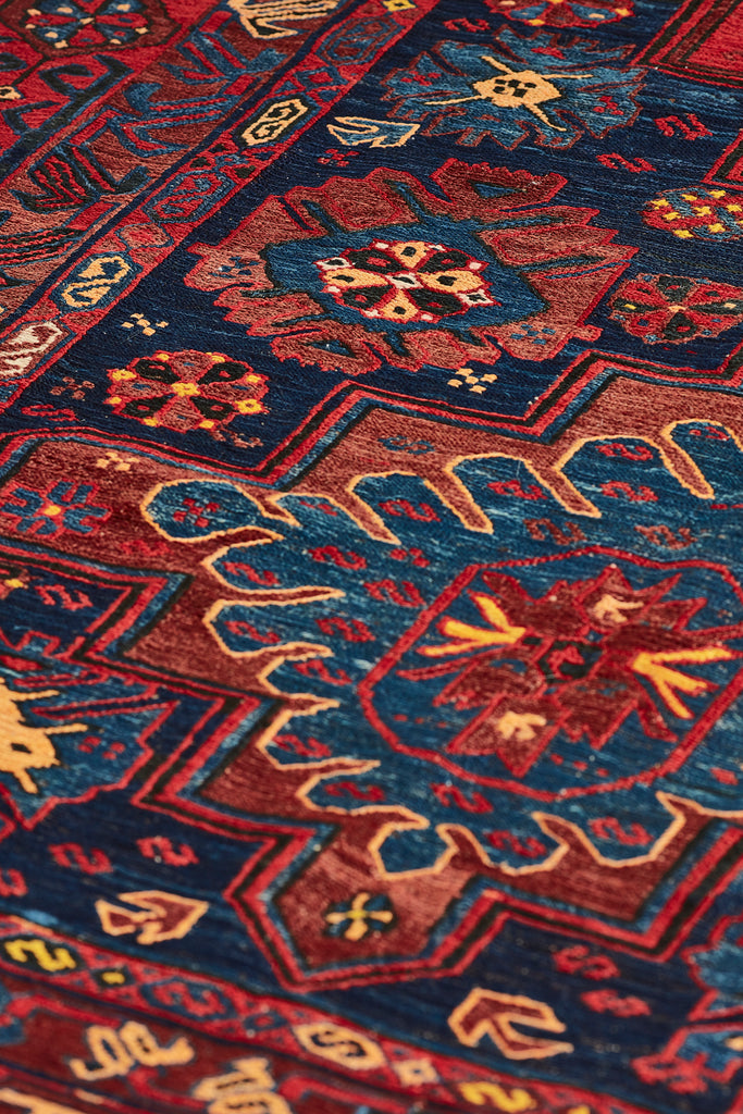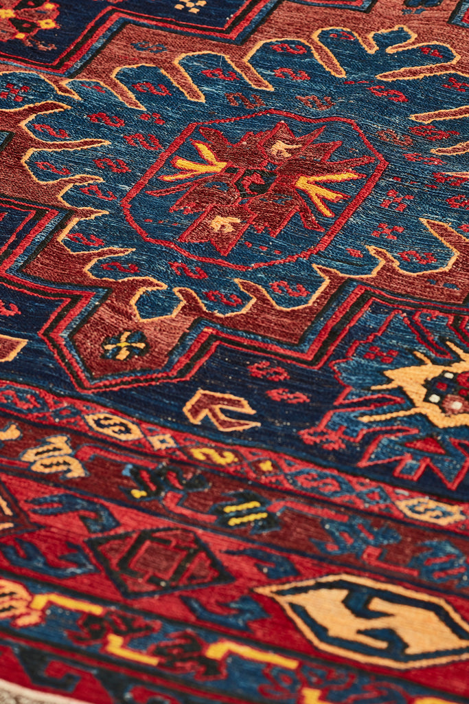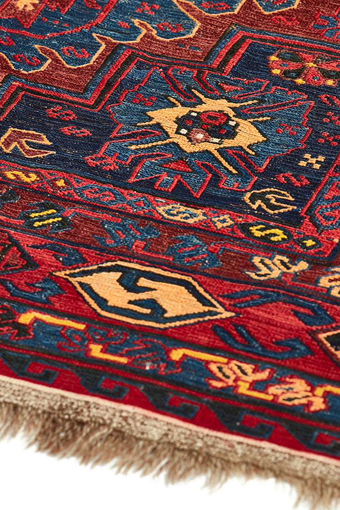 This beautiful antique Soumak rug is very tightly woven and is an incredibly robust and durable rug. It has bold, rich colours that have been made using natural dyes and an intricate design of florals. Unusual pops of yellow make this a very happy and vibrant rug.  Aged circa early 20th Century.