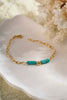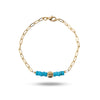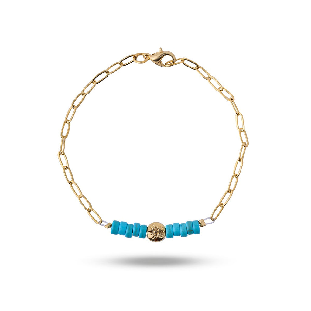 This bracelet has been hand-crafted in Turkey with a square gold-plated brass chain with blue Afghan turquoise beads and an evil eye to protect you. Finished with a gold-plated brass clasp.