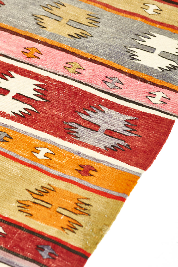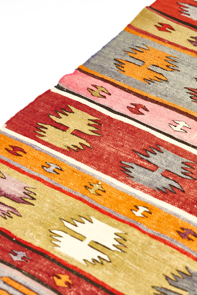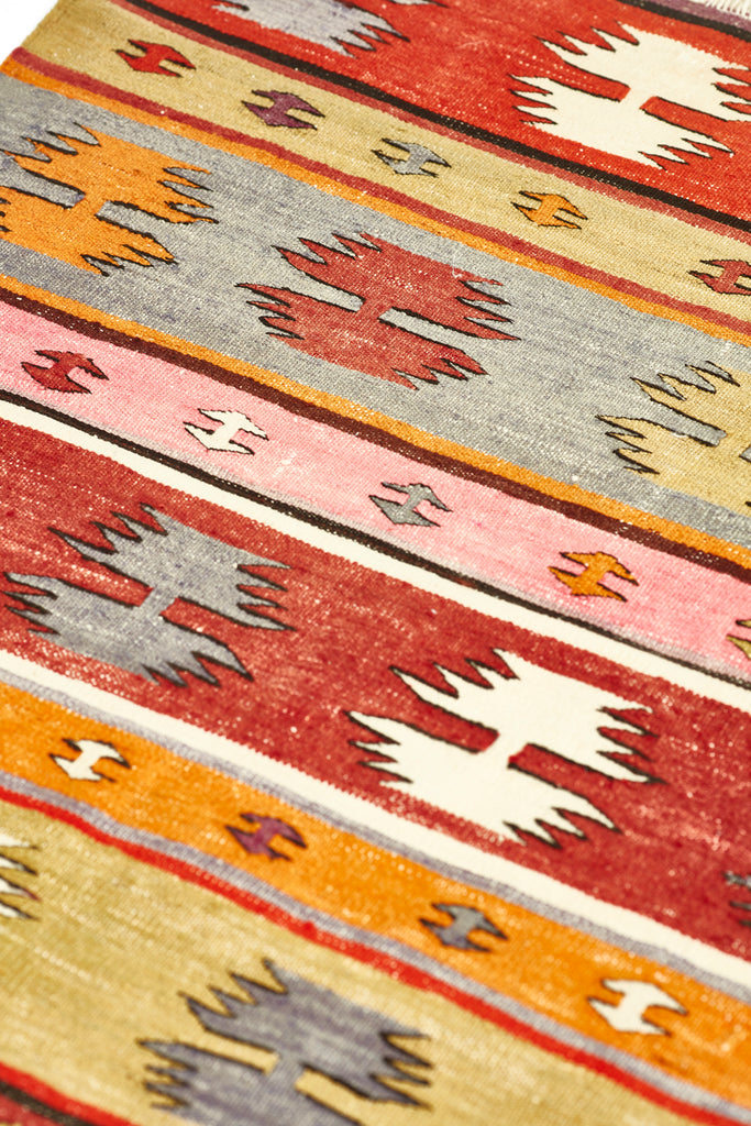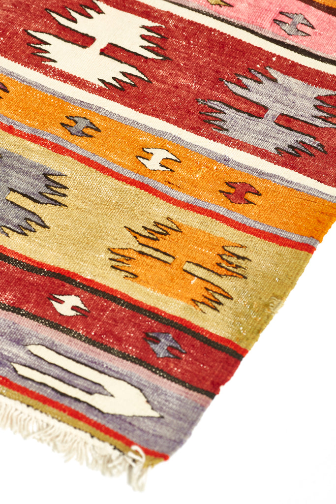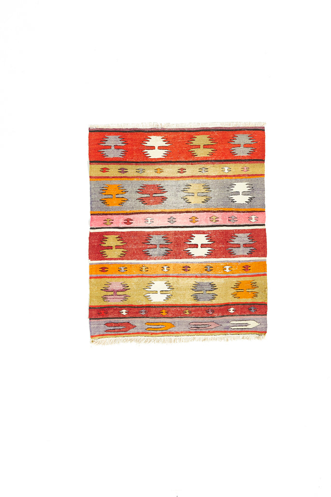 Aga is a small semi-old kilim from Anatolia in Turkey. In excellent condition, finely woven and beautifully bold. This striking little piece will add character to any space. A very useful size for entrance, bathroom, laundry or anywhere that needs cheering up.