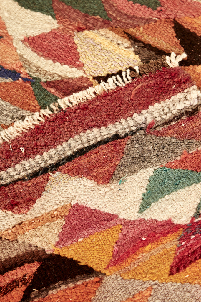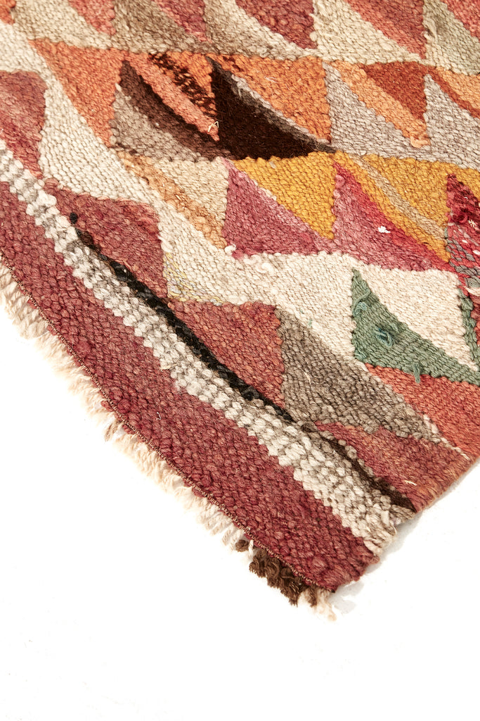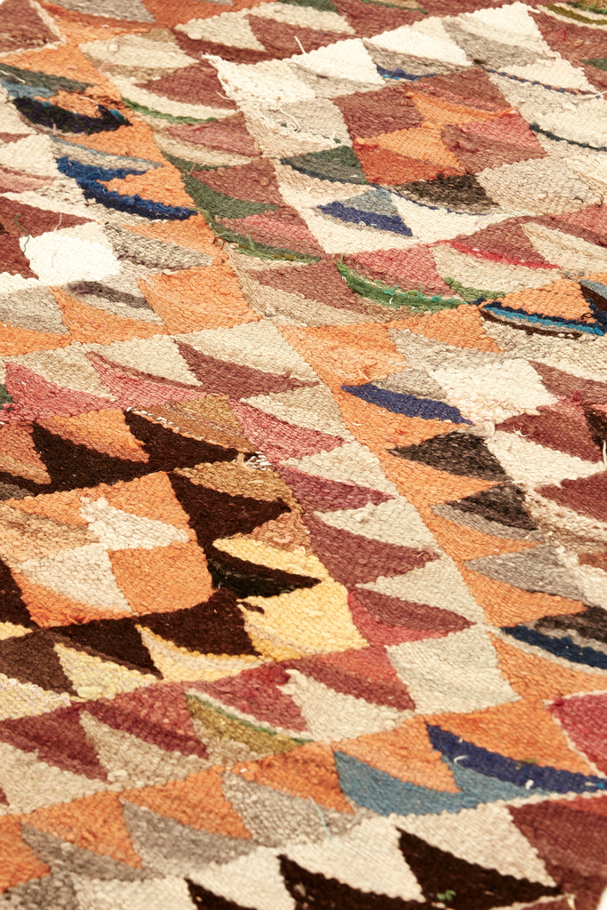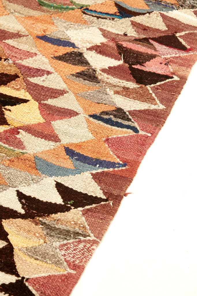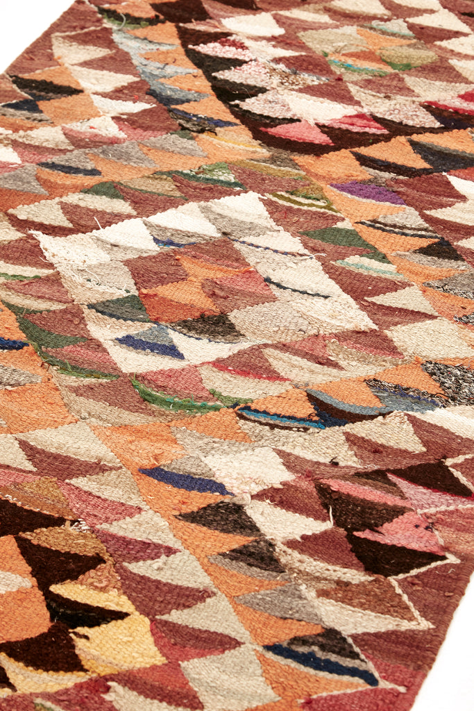 Daana is a thickly woven village kilim runner. This runner is beautiful and has soft hues  of the rainbow that work harmoniously with each other. Woven in 100% wool that has a rag rug style with loose threads and a casual design.
