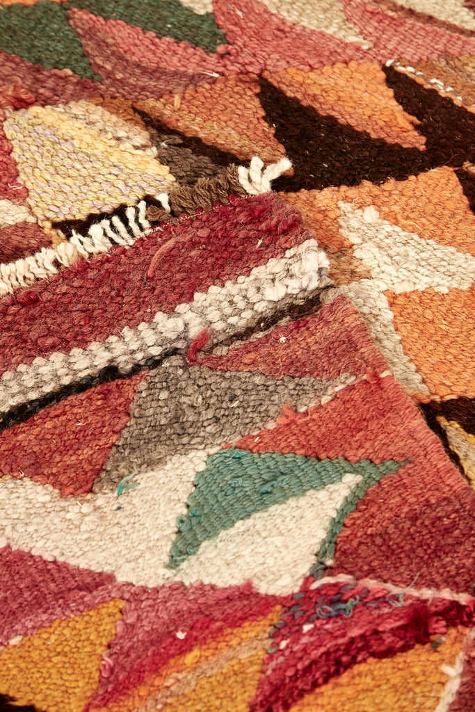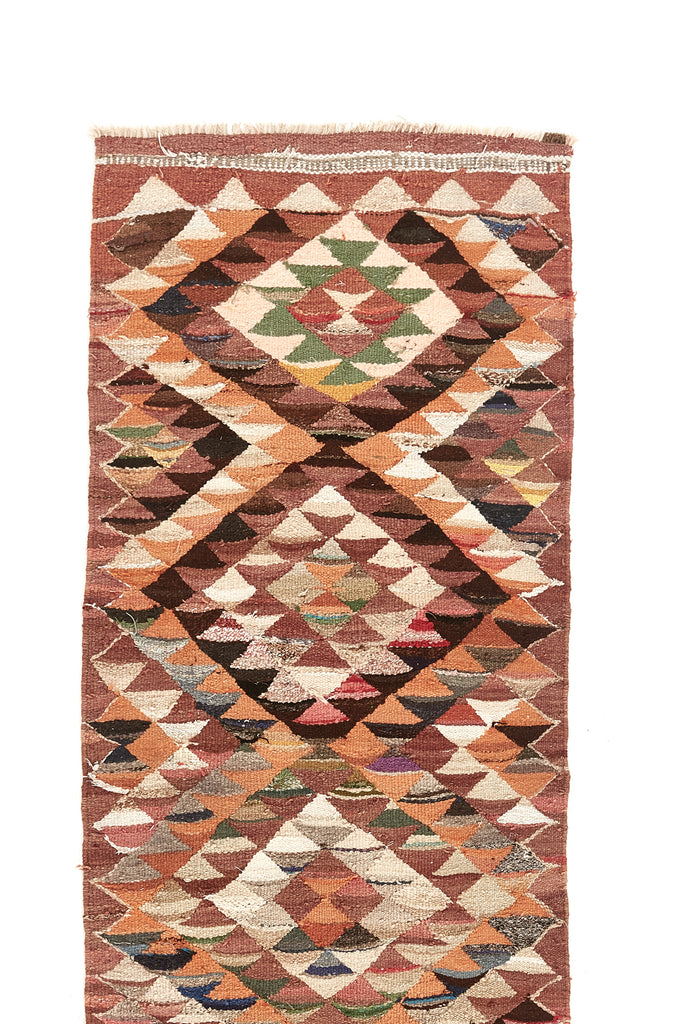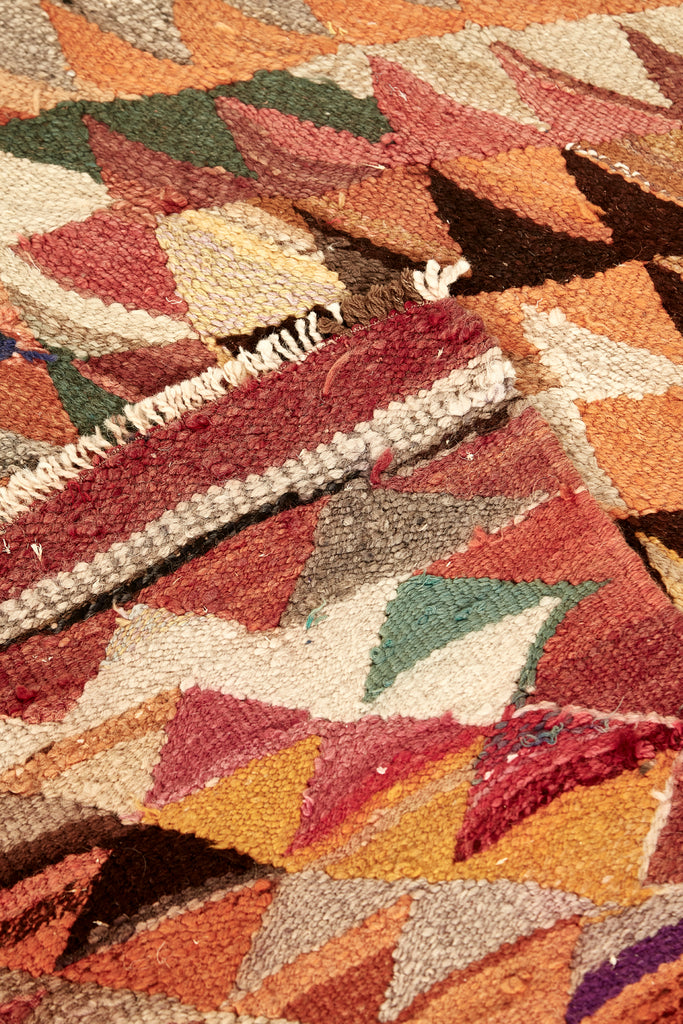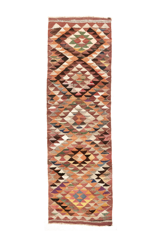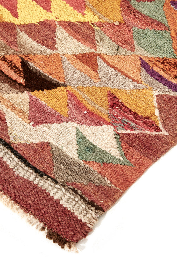 Daana is a thickly woven village kilim runner. This runner is beautiful and has soft hues  of the rainbow that work harmoniously with each other. Woven in 100% wool that has a rag rug style with loose threads and a casual design.