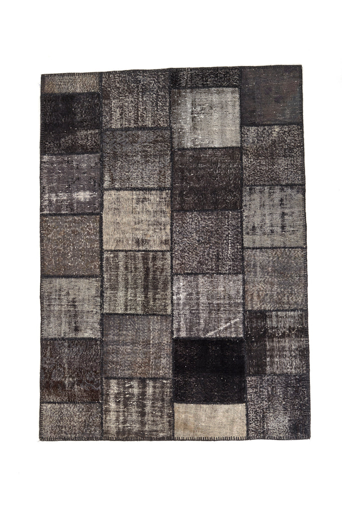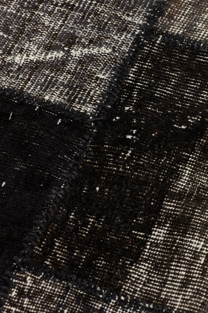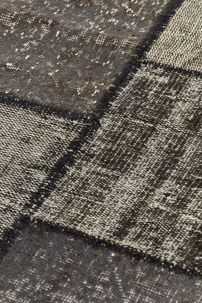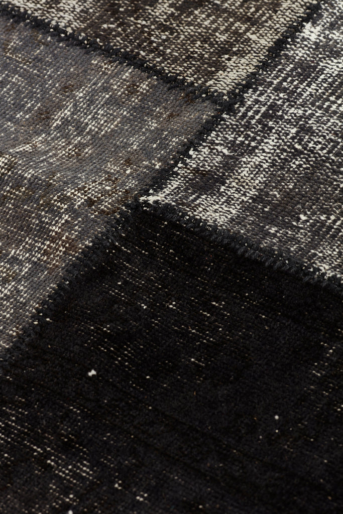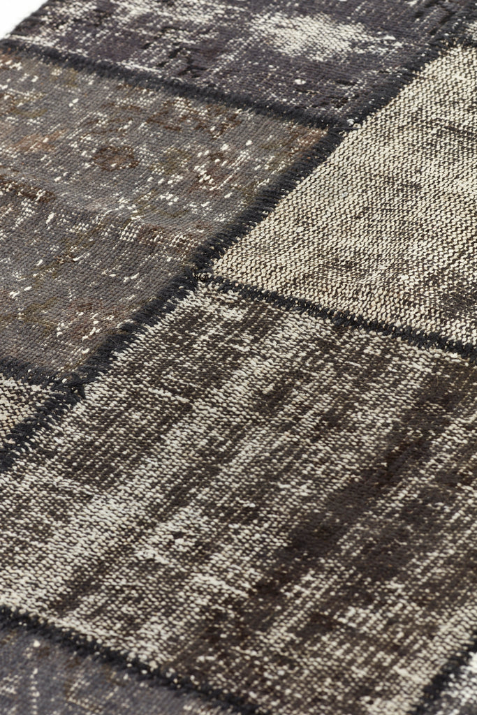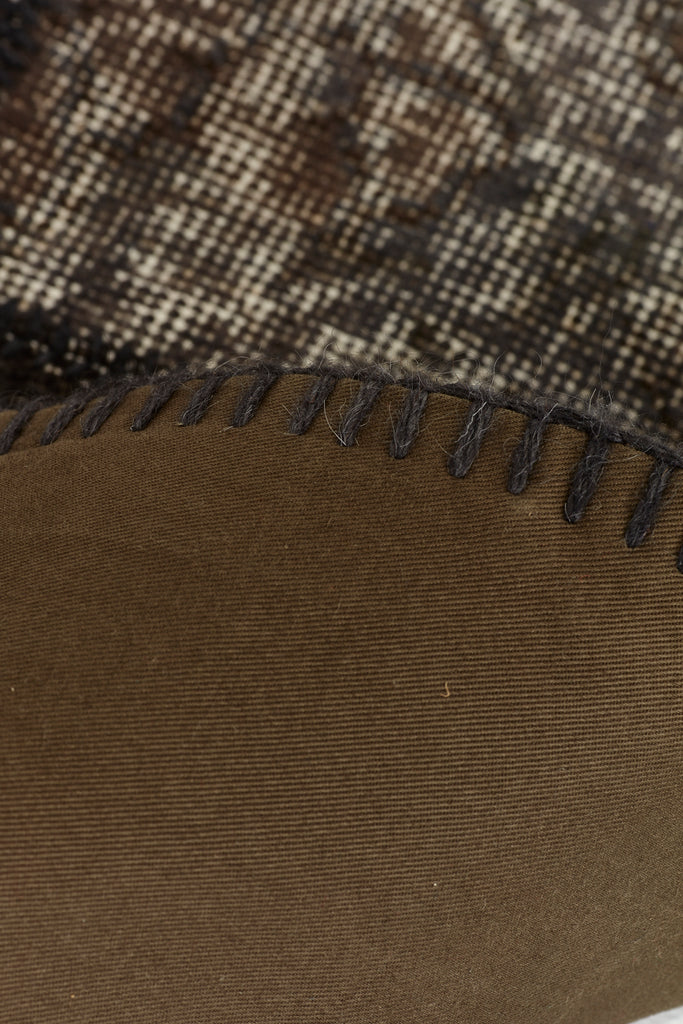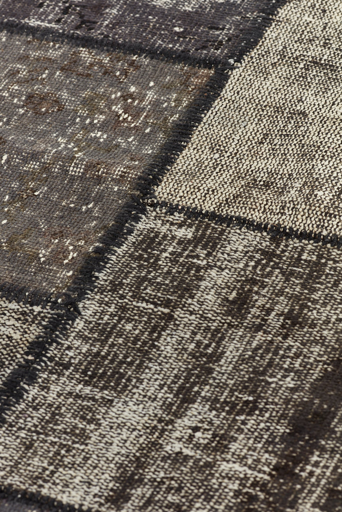 This rug has been created from fragments of old knotted pile rugs. Pieces from vintage rugs are arranged in patchwork style (an art in itself) then stitched together in blanket stitch, using a super strong thread; 50% cotton, 50% non-flammable polyester.