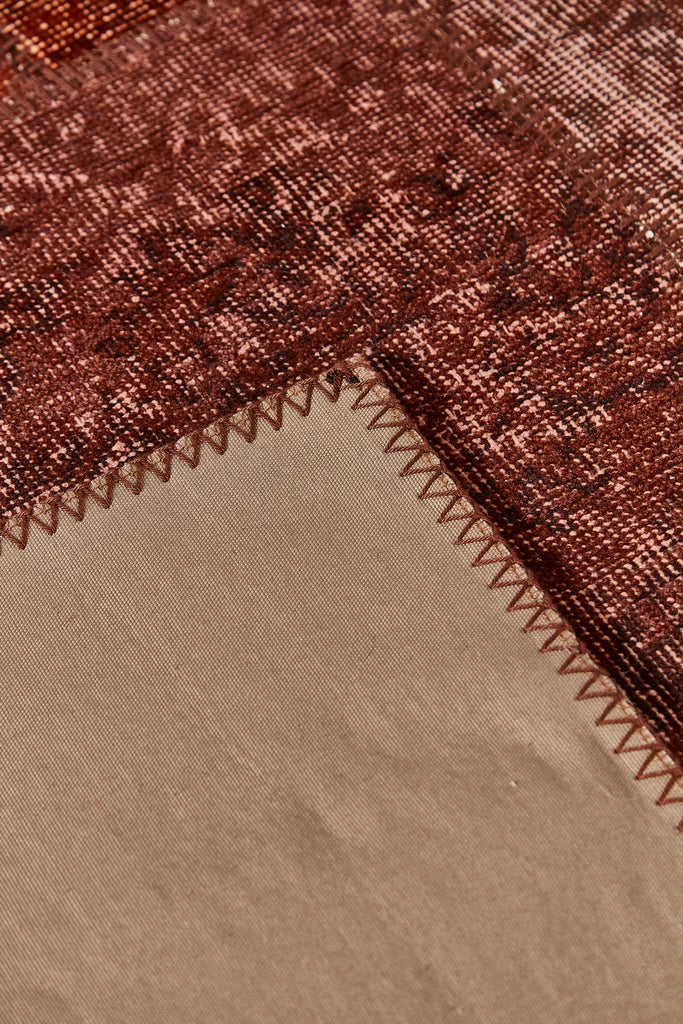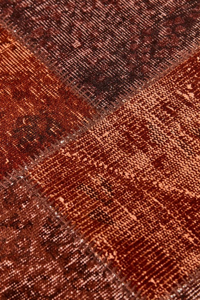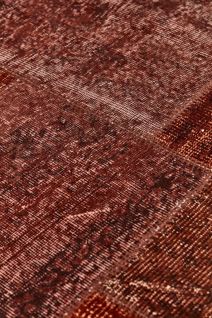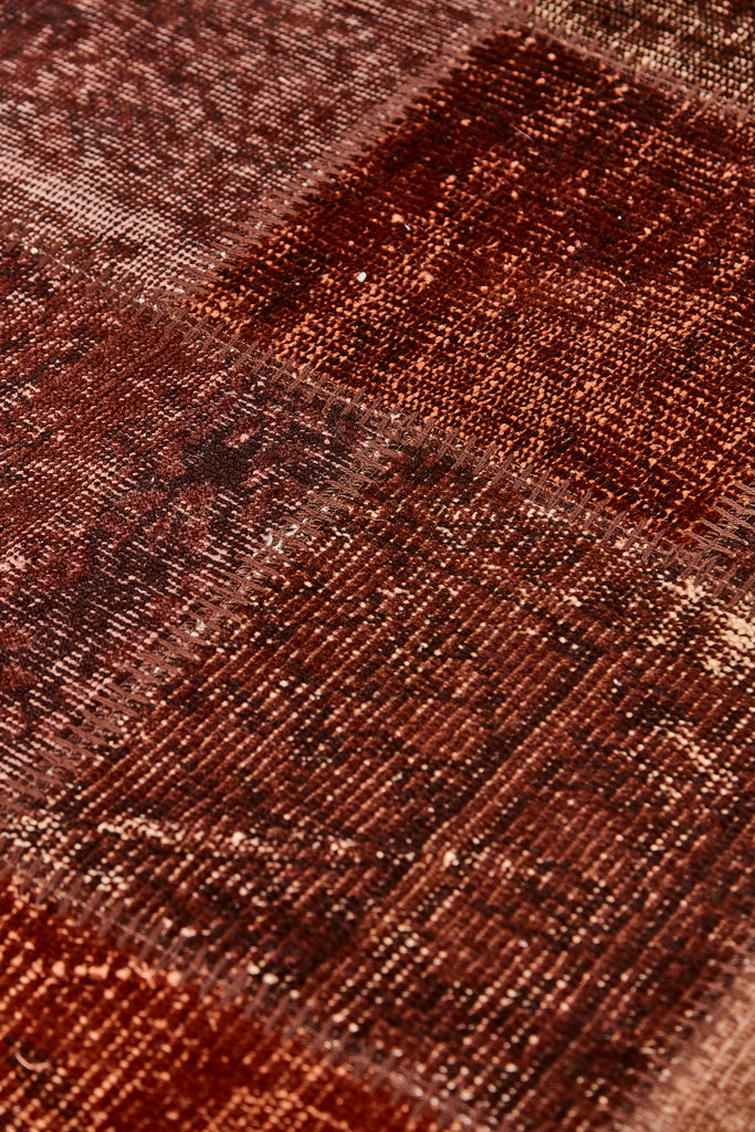Rostam is a Turkish overdyed patchwork rug. This rug has been created from fragments of old knotted pile rugs. Pieces from vintage rugs are arranged in patchwork style (an art in itself) then stitched together in blanket stitch, using a super strong thread; 50% cotton, 50% non-flammable polyester.