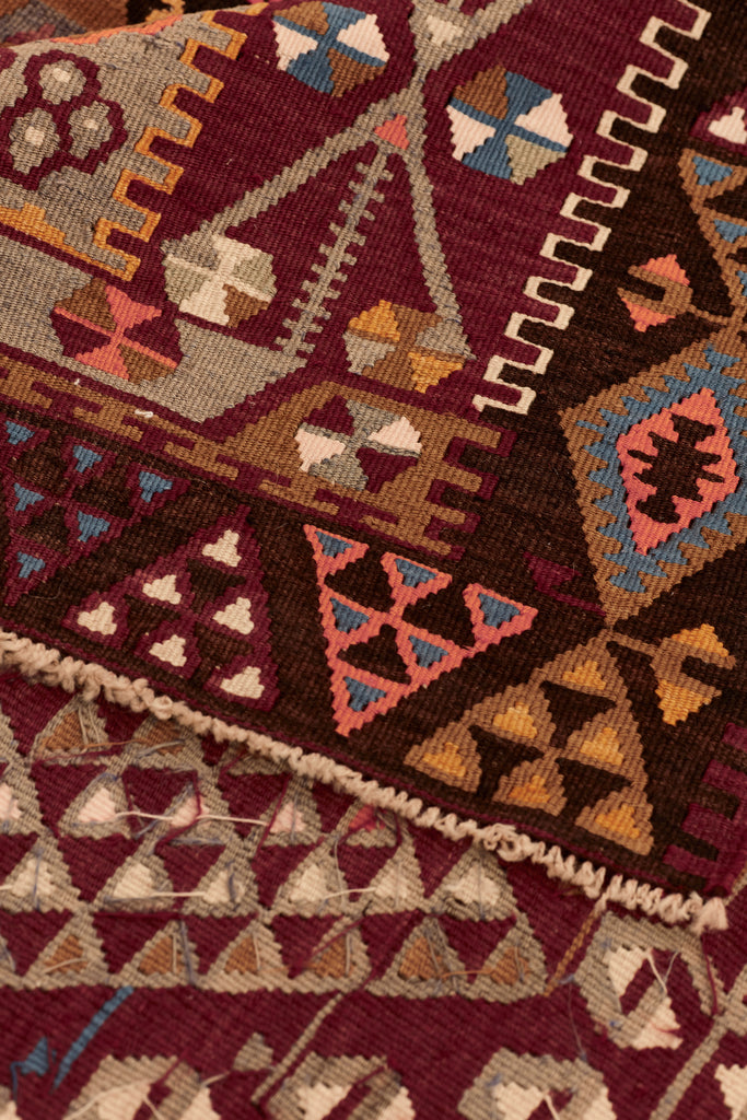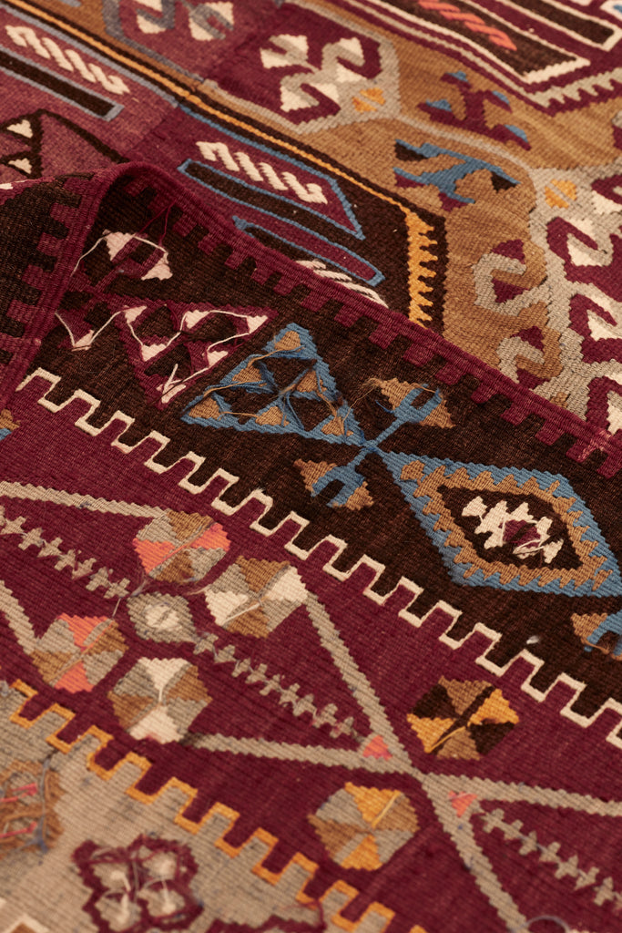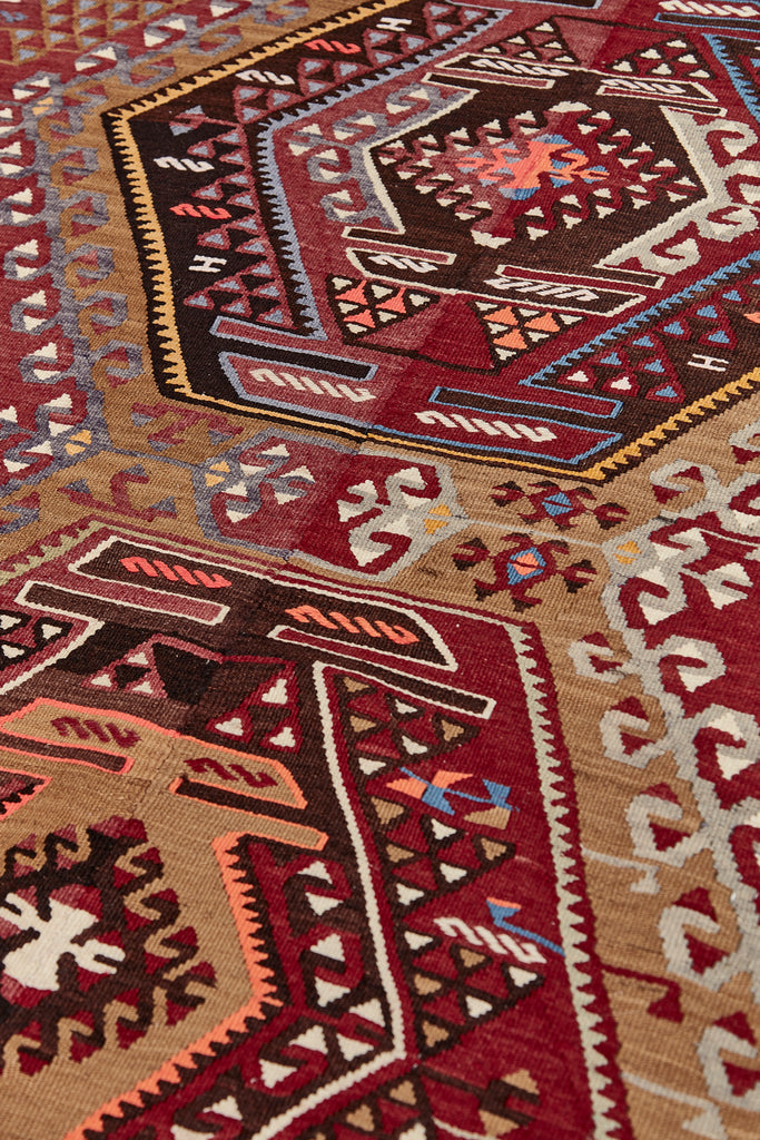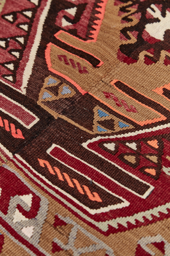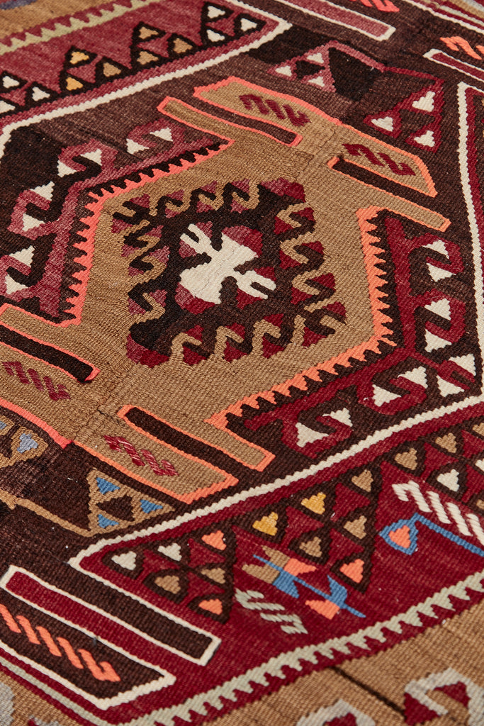 This kilim has been woven in two pieces and joined down the middle. Each side mirrors the other with small and interesting differences including slight differences in shades of colour. This piece has beautiful pops of orange throughout that make the green and burgundy/purple field really shine. This rug is hard to photograph accurately so please be in touch for more photos if needed.