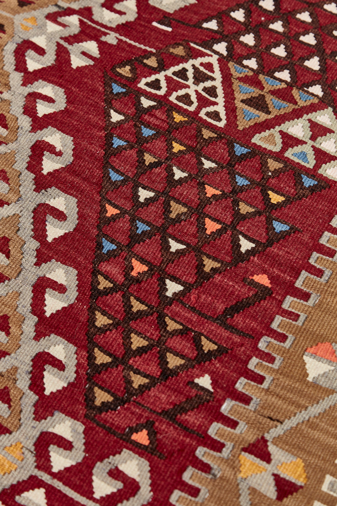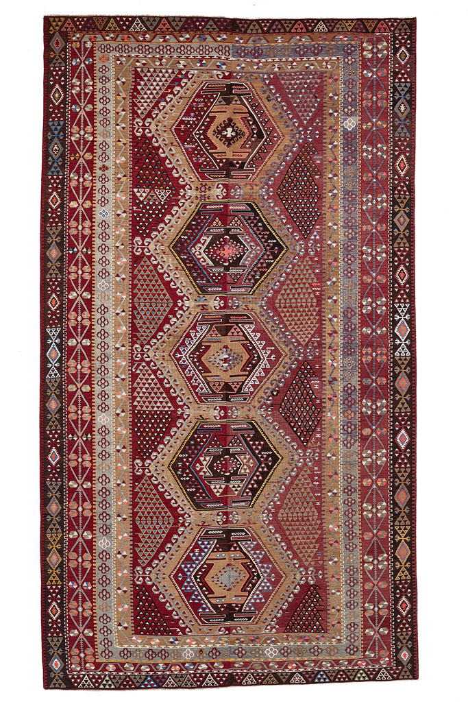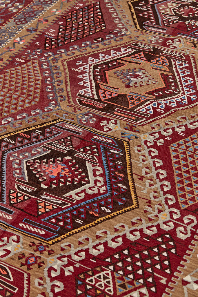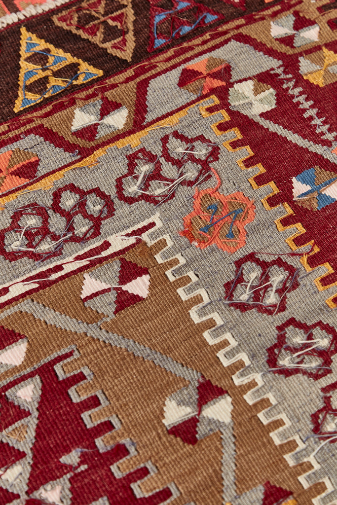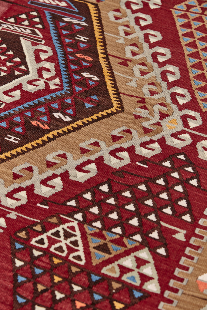 This kilim has been woven in two pieces and joined down the middle. Each side mirrors the other with small and interesting differences including slight differences in shades of colour. This piece has beautiful pops of orange throughout that make the green and burgundy/purple field really shine. This rug is hard to photograph accurately so please be in touch for more photos if needed.