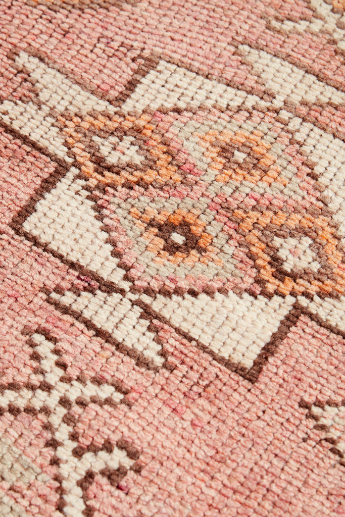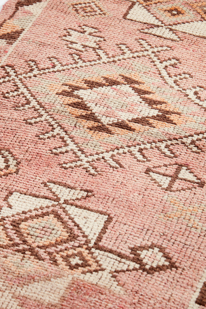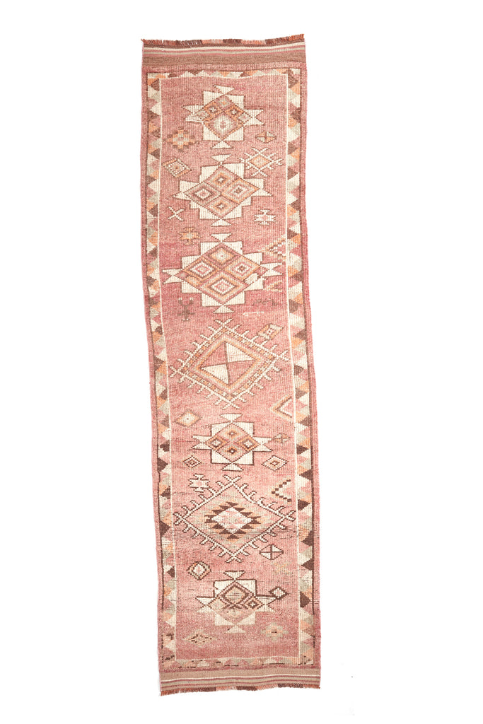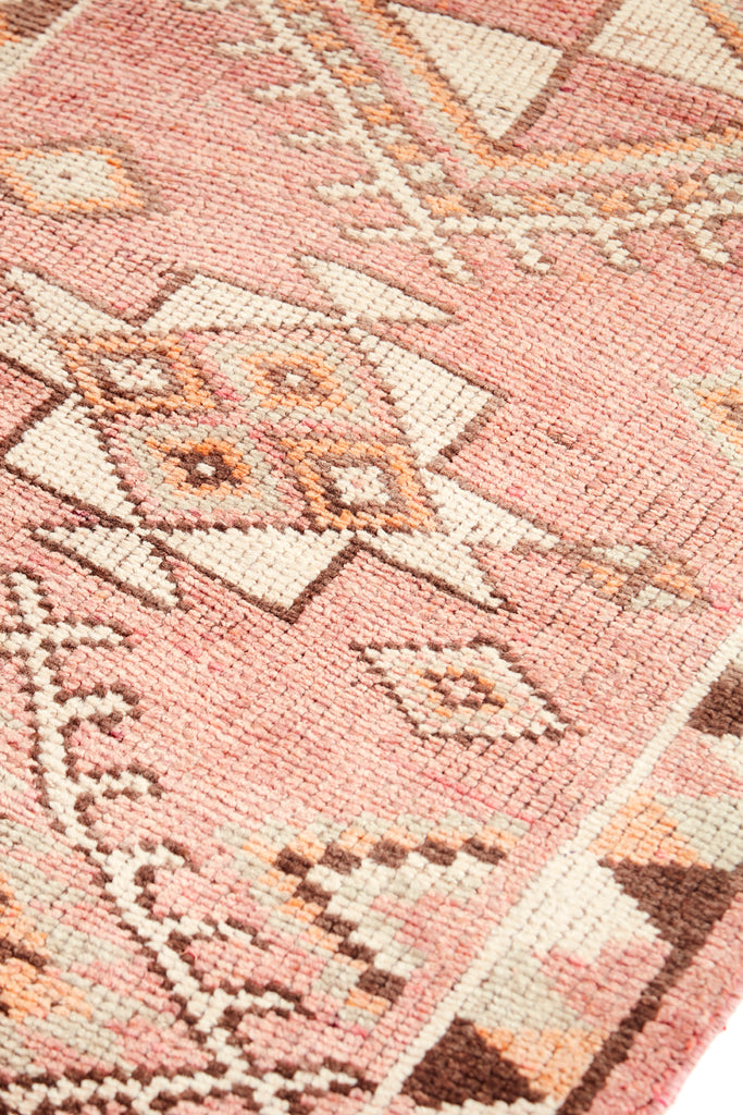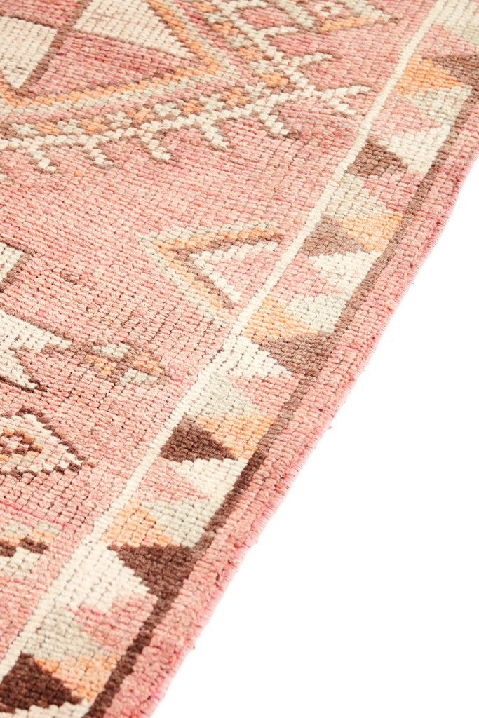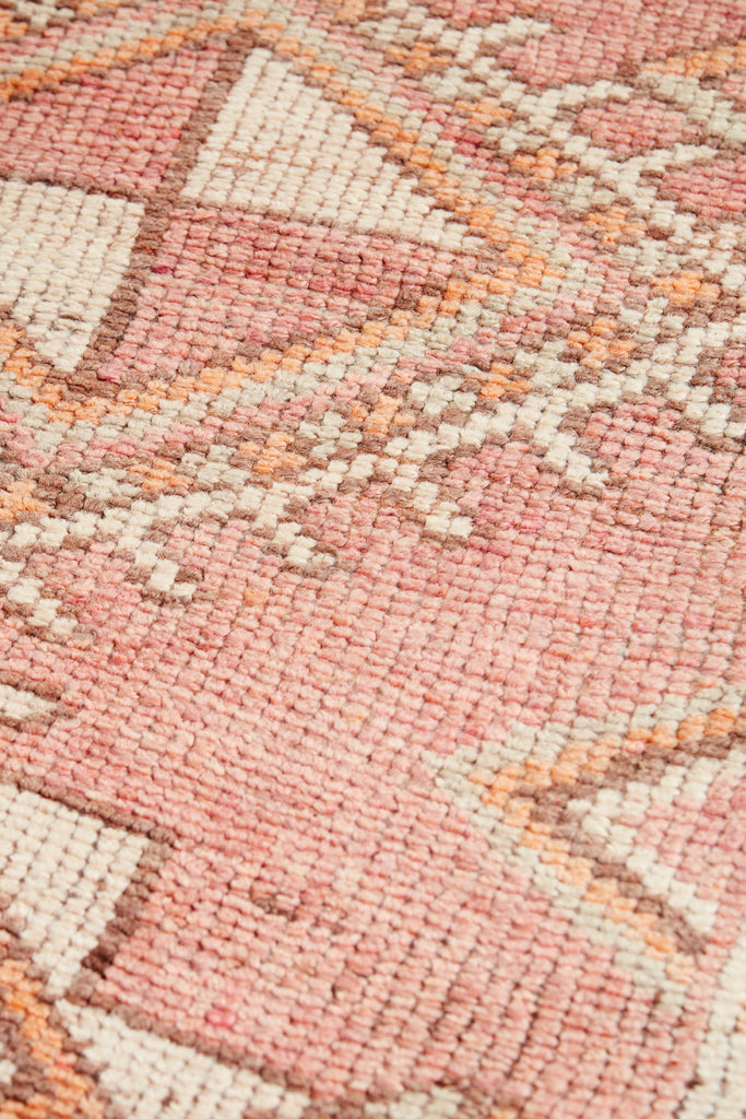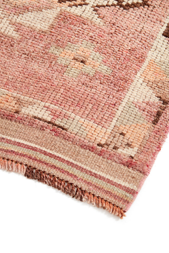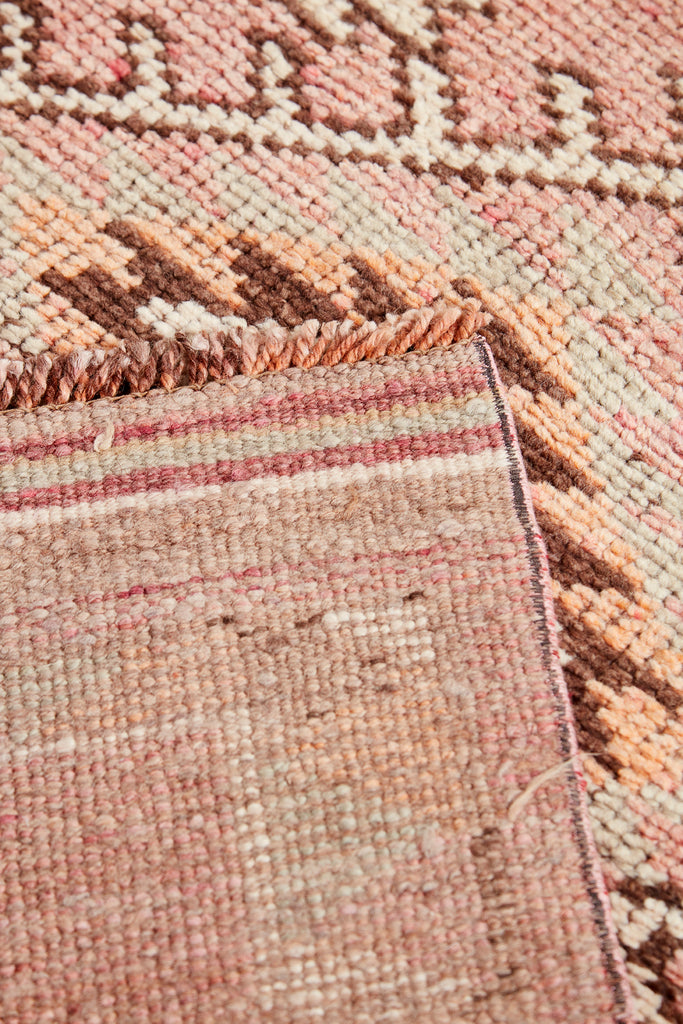 Ara is a very striking vintage knotted pile runner which was handwoven in the mid 20th Century. Soft earthy pinks and browns, this is a bohemian dream.