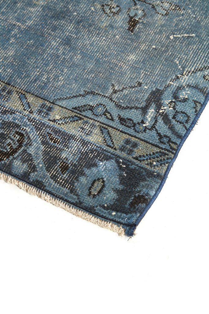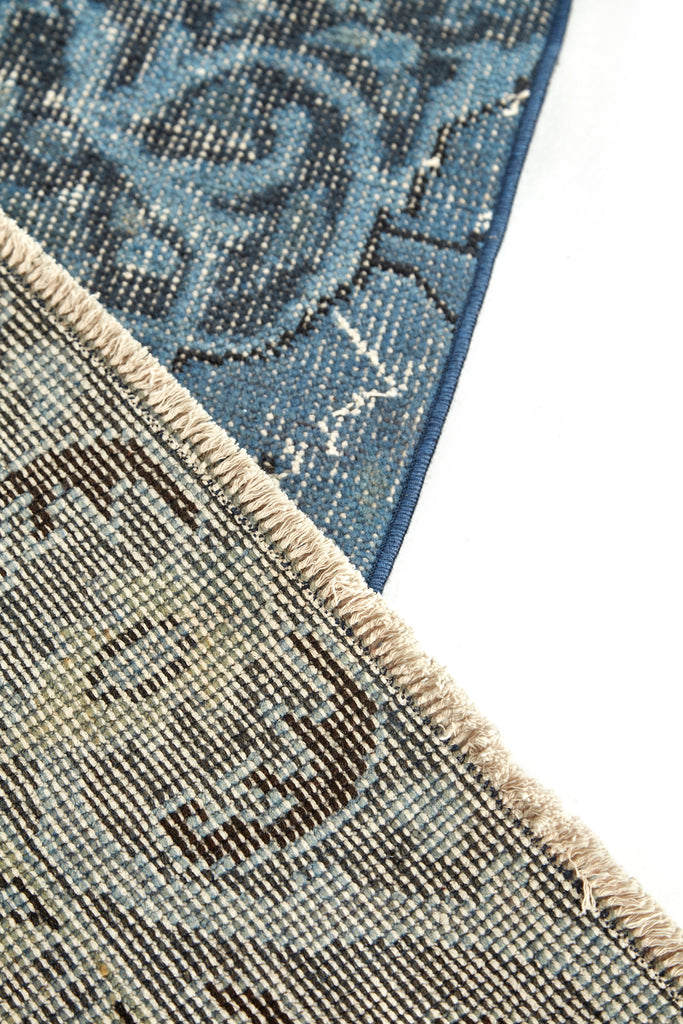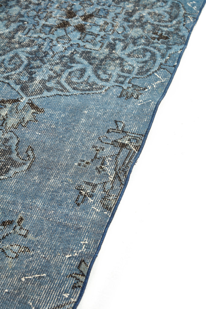 The pile on these old/new rugs has been pared back, the original dyes neutralized, then the rug over-dyed with a deeply saturated single colour. This process creates a modern and slightly distresses feel to these vintage pieces.