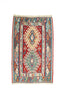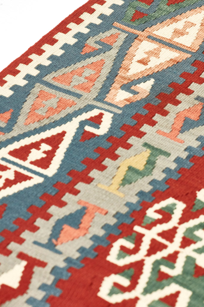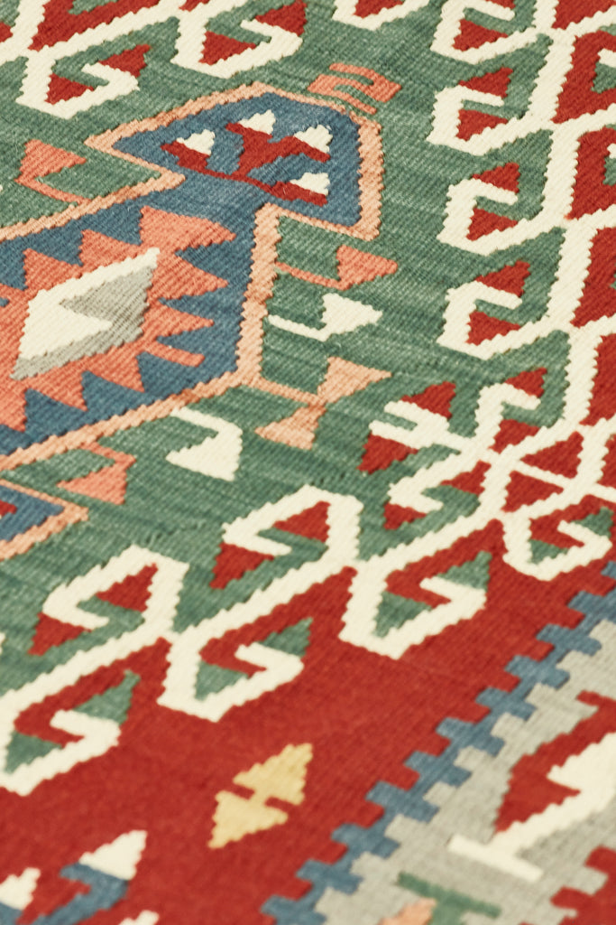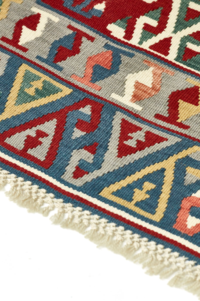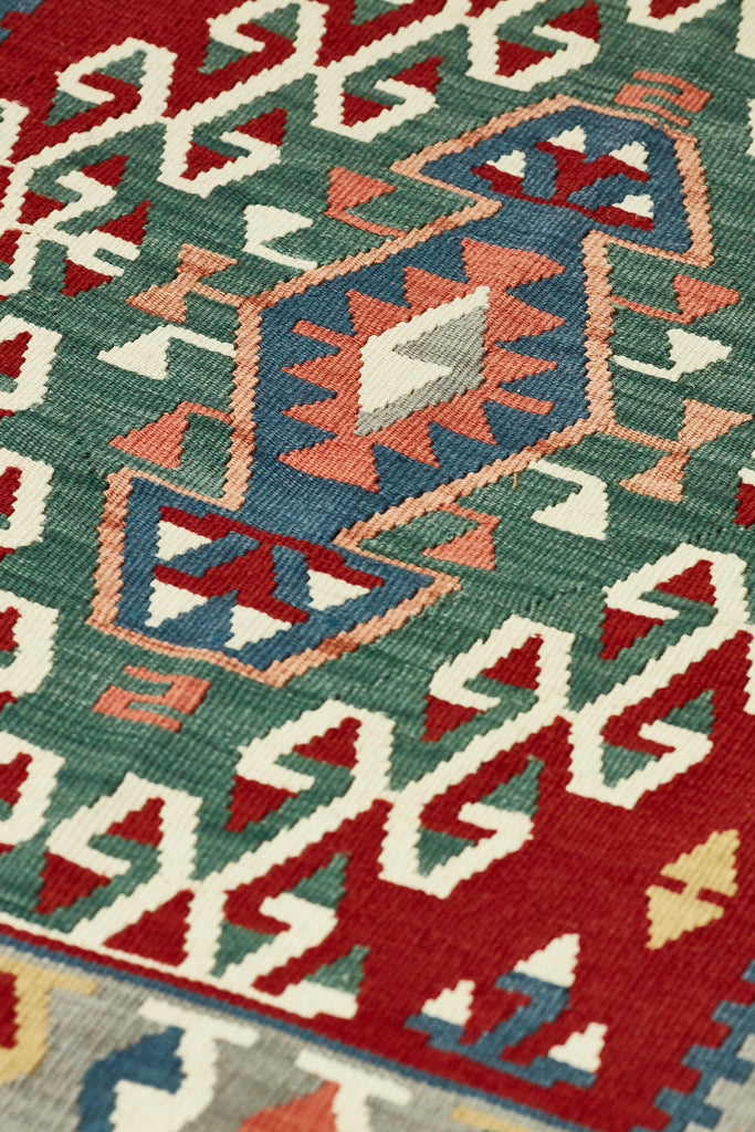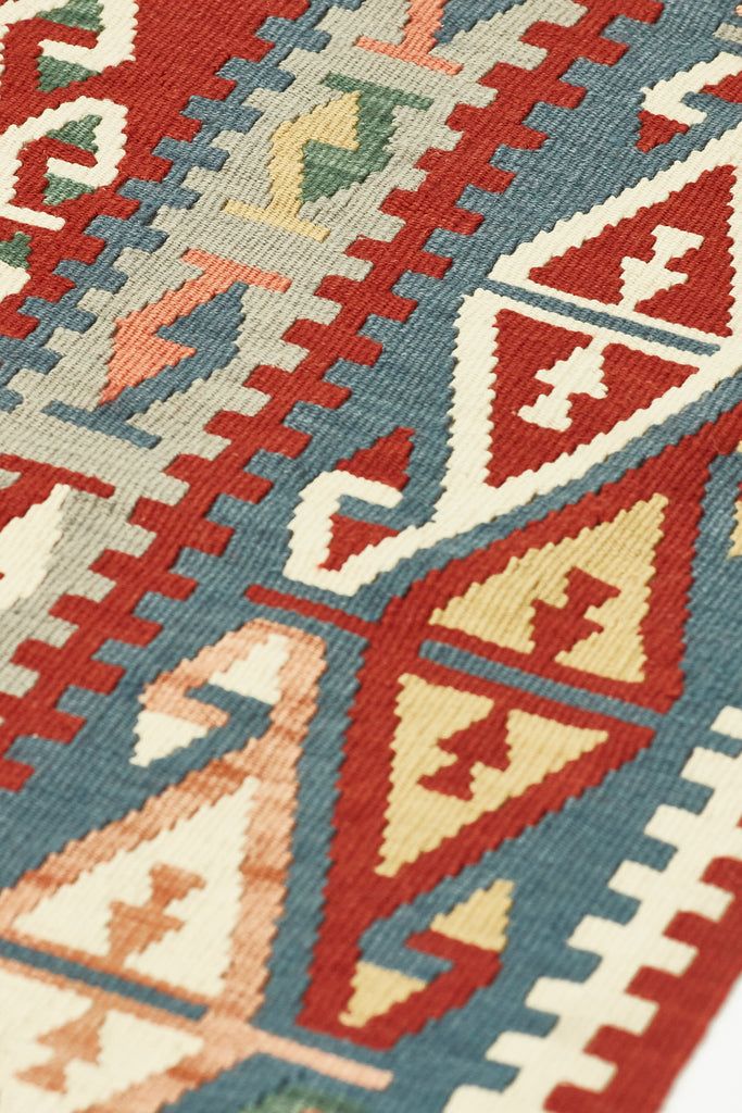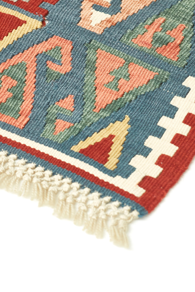 Taj is a lovely vintage kilim from Kayseri which is a large industrialised city in central Anatolia. Kayseri rugs are known for their soft colours and soft loose weave, athough this kilim packs a little more punch with lovely depth of colours and is in excellent condition.