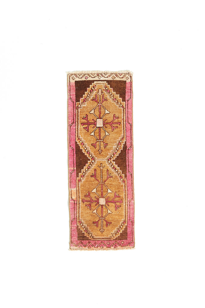 Zel is a mini vintage Turkish knotted pile rug from the city of Kars in North Eastern Turkey. These Mini Rugs are known as 'Yastiks' - small pillows that were used by nomads that have now been turned into tiny floor rugs in their second life.